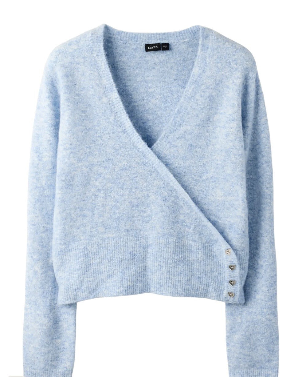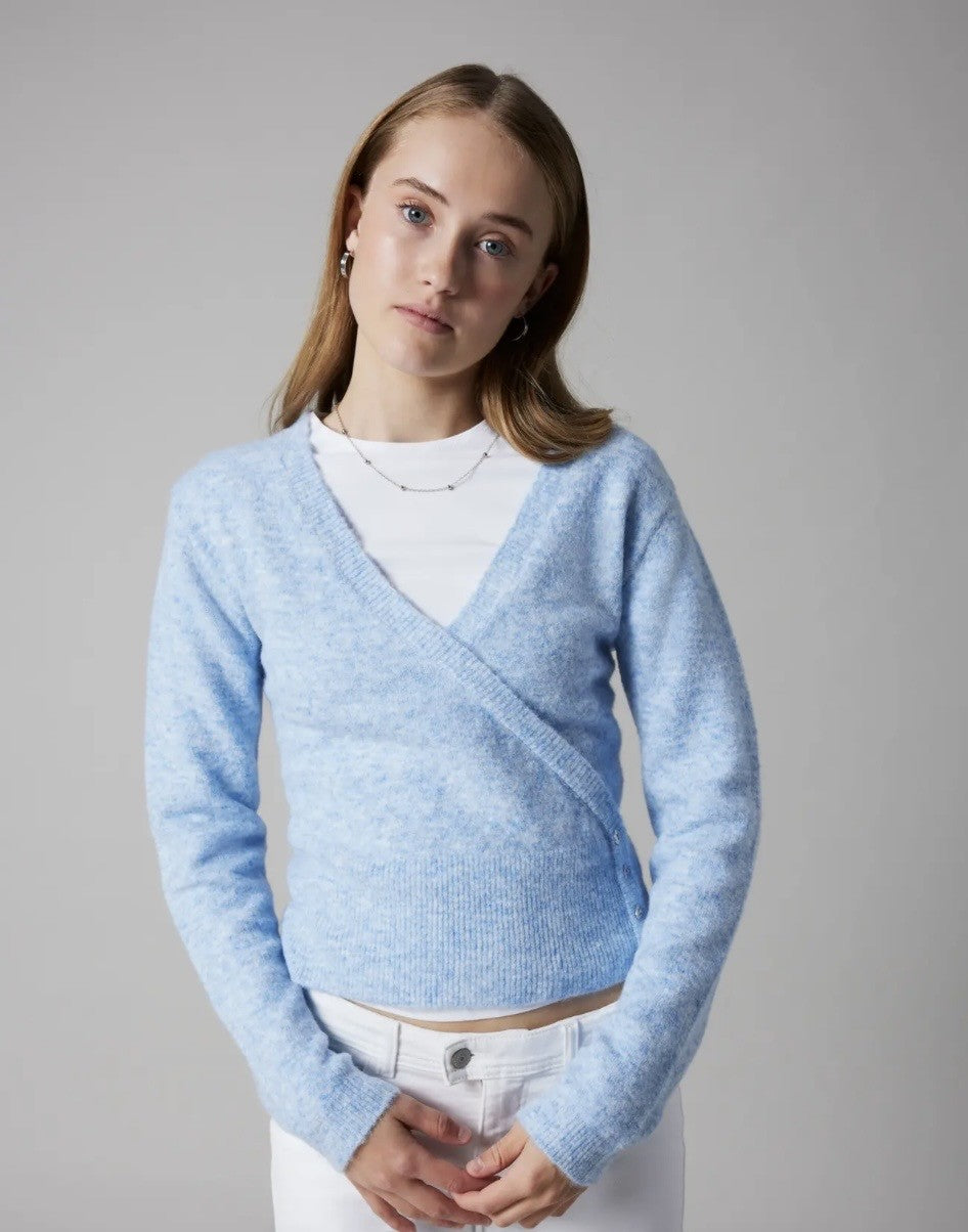 Toppen har en clean og tidløs flatstrikket look, med V-hals, lange ermer og en kul, dekorativ omslagsdetalj som gir antrekket det lille ekstra. Passformen er behagelig med regular fit, så den sitter fint uten å føles stram.